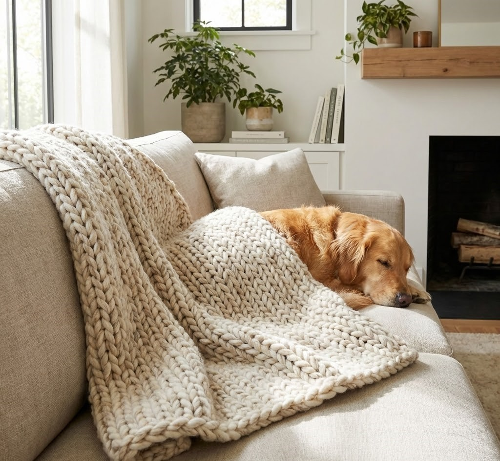 特色: 溫暖厚實的粗針織紋理,可鋪在沙發上防止毛髮沾染,或給狗狗蓋著小憩,為空間增添一抹溫馨的 Hygge 氛圍。